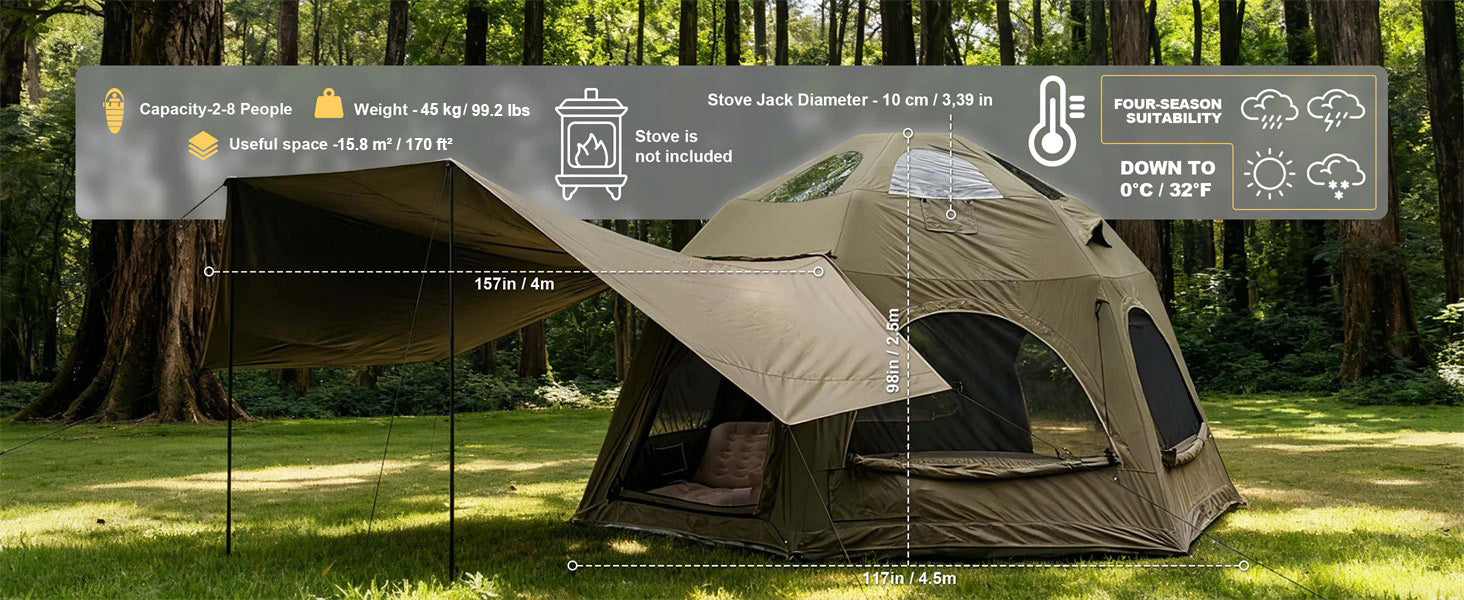 • Spacious for 6-8 People: Features a 142 sq. ft. area with a 98-inch standing height, offering ample room to move freely.